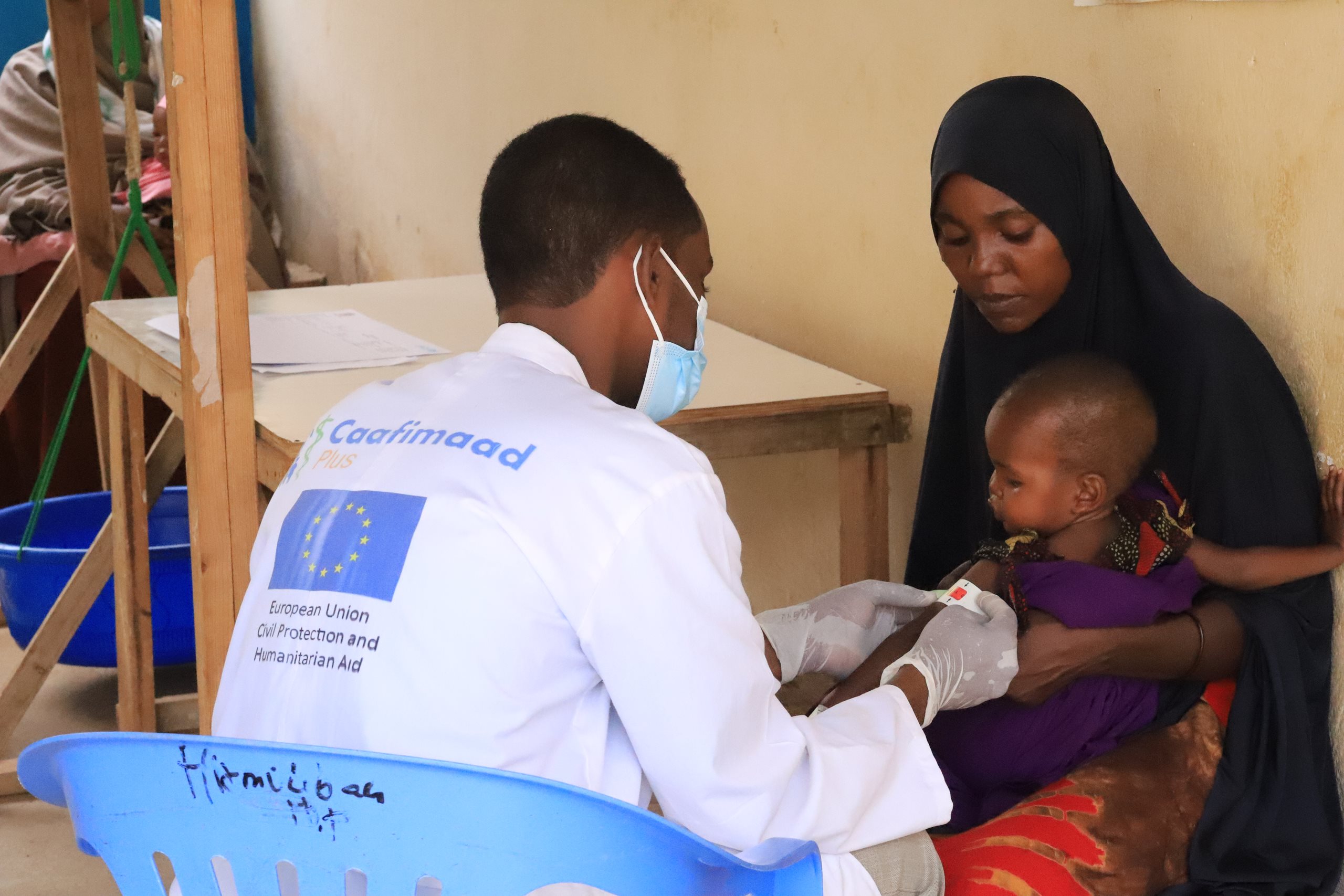 After neighbors who had previously received compassionate care at Baidoa District Hospital, run by SOS Children’s Villages, shared their experiences, Madina took Sahara there, where all services are free thanks to the support of the European Civil Protection and Humanitarian Aid (ECHO) through the CaafimaadPlus Consortium. Upon arrival, Sahara was immediately examined and diagnosed with severe acute malnutrition (SAM), with a Mid-Upper Arm Circumference (MUAC) of just 10.4 cm. She was feverish, unconscious, and fighting infections.